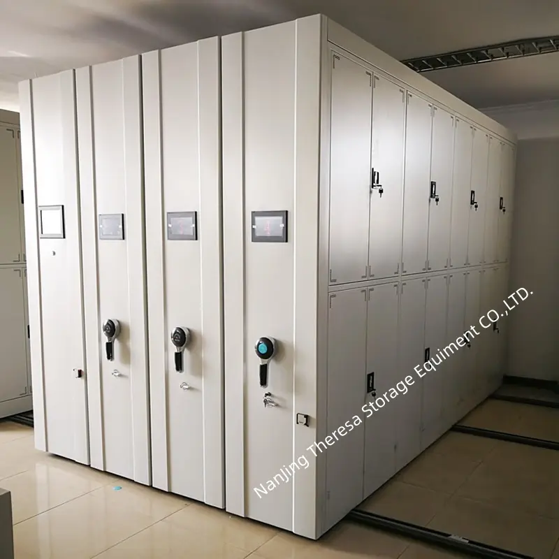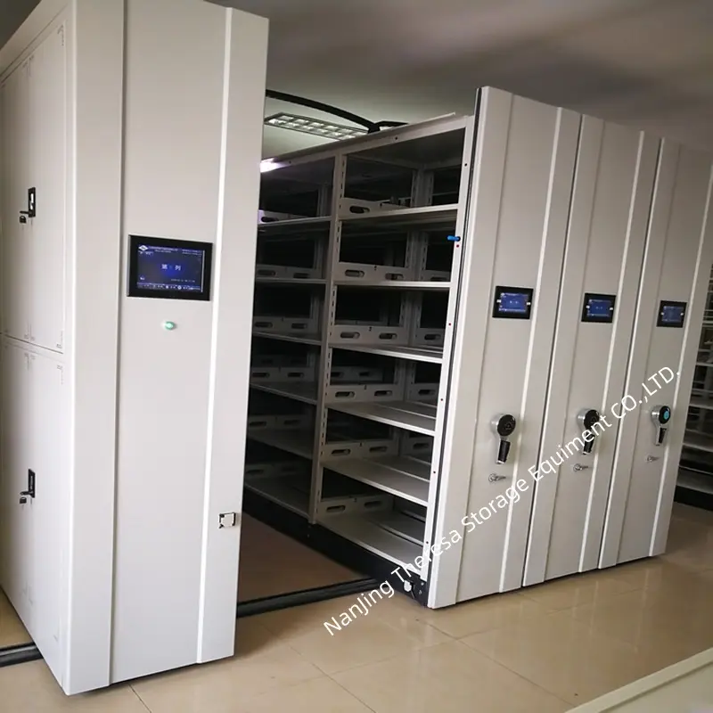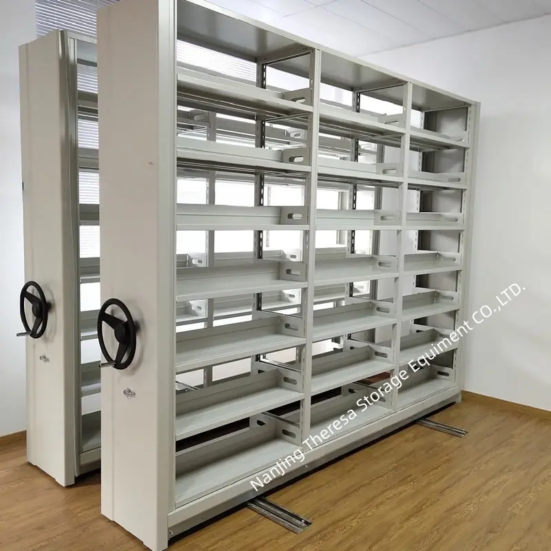 移动式货架为密集型档案档案装具的一种,是在双面固定架的底座上安装轴轮,能沿地面铺设的小导轨直线移动的架子,可根据需要将多个架子靠拢或分开。分手动和电动两种,手动又有手摇式和手推式 。走动方向有横向和纵向之分。该架将固定通道变为机动通道,使库房单位面积上的档案存储量增大,但对库房地面的承载力要求也高。用于机关、企事业单位图书资料室、档案室、样品室等存放图书资料、档案、财务凭证、货物等与传统式书柜、书架、货架、档案架相比,存储量大,有系统性;每列之间的接触面配有缓冲,磁性密封条顶部有防尘板,底部有防鼠装置, 每列设有限位制动装置及防倾倒装置,边列有锁具,用于整体锁闭,传动机构通过精加工处理,使用精密轴承,传动灵活比较平稳,层板间距根据需要可调节;为密集存储的比较好设备。 密集架规格: (非标规格可以定做) 规 格 (高×长×宽) 移动档案柜/密集架 (2000~2500)×900×500mm 移动档案柜/密集架 (2000~2500)×900×550mm 单面固定档案柜/密集架/书架 (2000~2500)×900×274mm 双面固定档案柜/密集架/书架 (2000~2500)×900×500mm 移动密集架 移动式货架/移动式档案柜/移动式密集柜密集架 密集架 中间配隔板结构的移动式货架,底部导轨为镀铬(该结构为定制品) 智能密集架 智能档案柜/智能密集架 电动密集架显示屏和遥控器 智能档案柜的显示屏和遥控器 电动密集架 智能密集架
