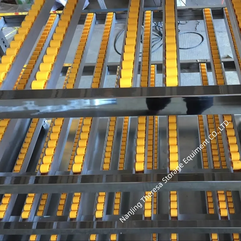 流利式货架通常采用两种流利条;板金流利条和铝合金流利条板金流利条支架部分采用板金,滚轮为尼龙轮轮直径28mm,轮中心距为33 mm,颜色为黄色。